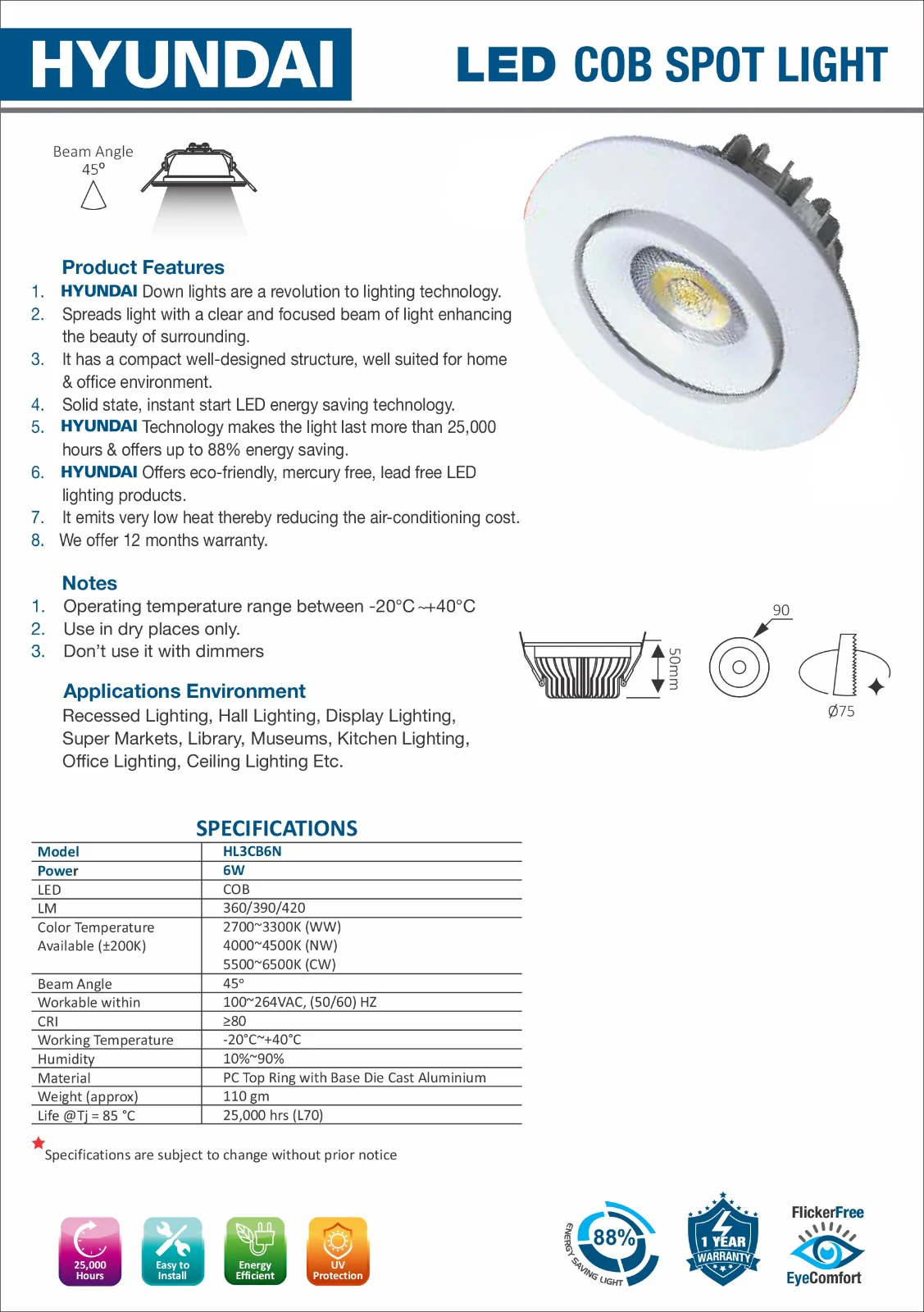 Hyundai LED COB Spot Light 6W (HL3CB6N)