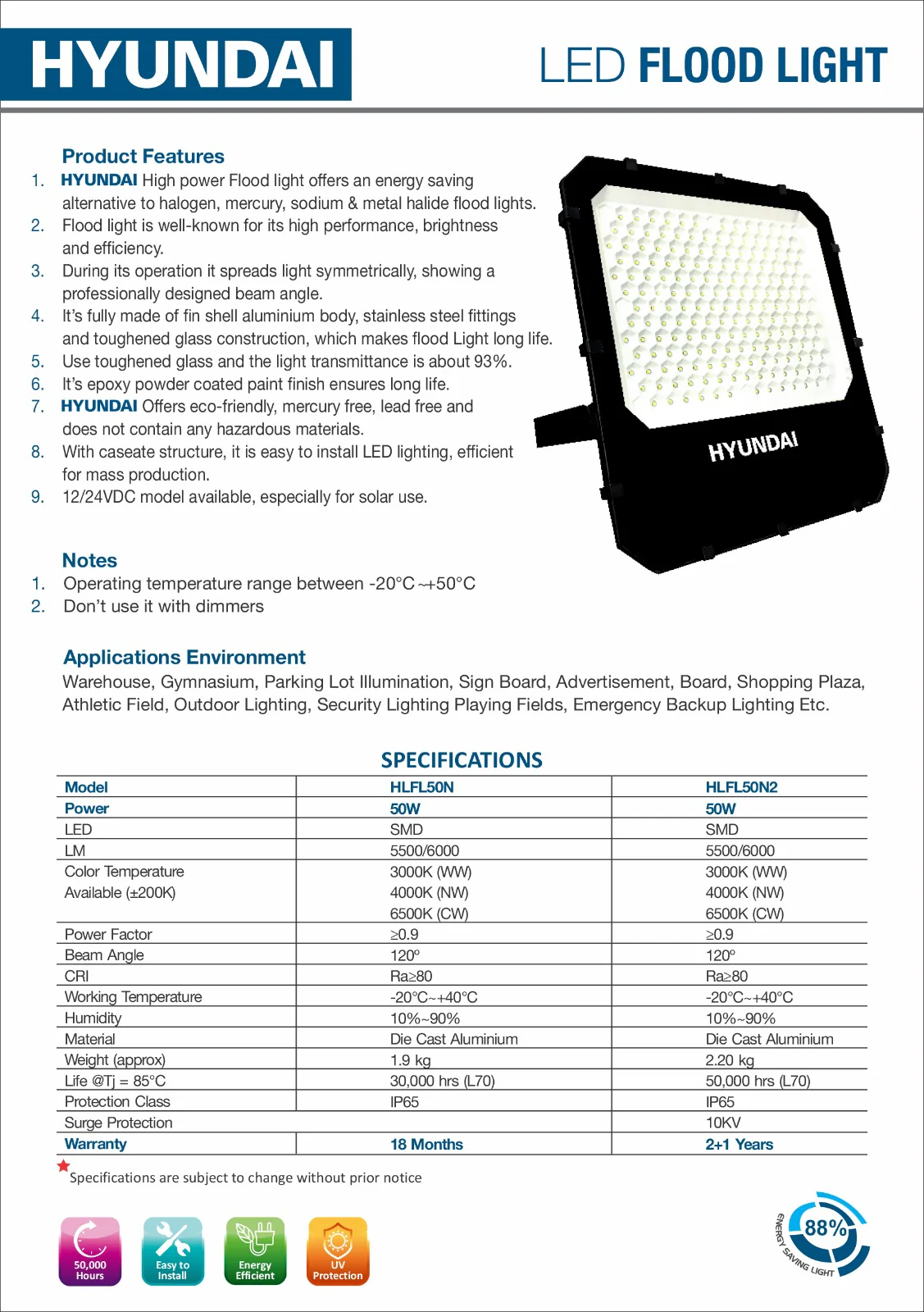 The Hyundai HLFL50N2 represents a versatile and efficient lighting solution that brings industrial-grade performance to a compact 50W form factor. This LED flood light is engineered to provide reliable, high-quality illumination for various outdoor and commercial applications while delivering significant energy savings compared to traditional lighting technologies. The fixture combines advanced optical design with rugged construction to ensure optimal performance in diverse environmental conditions.