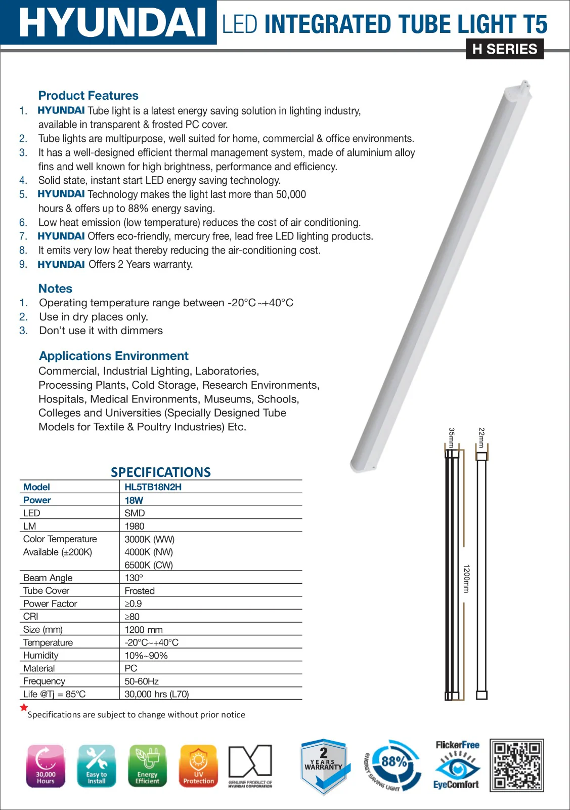 The Hyundai HL5TB18N2H represents the next generation of T5 LED integrated tube lighting, specifically engineered to meet the demanding requirements of contemporary commercial, industrial, and institutional environments. This 18W integrated tube light combines sophisticated engineering with user-friendly design, offering a complete lighting solution that eliminates the need for separate ballasts or drivers, simplifying installation and maintenance.